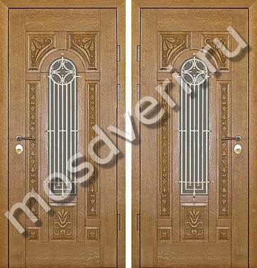 Входная дверь с резьбой, стеклом и ковкой из массива дуба — объединяет эстетичность и высокую надёжность.