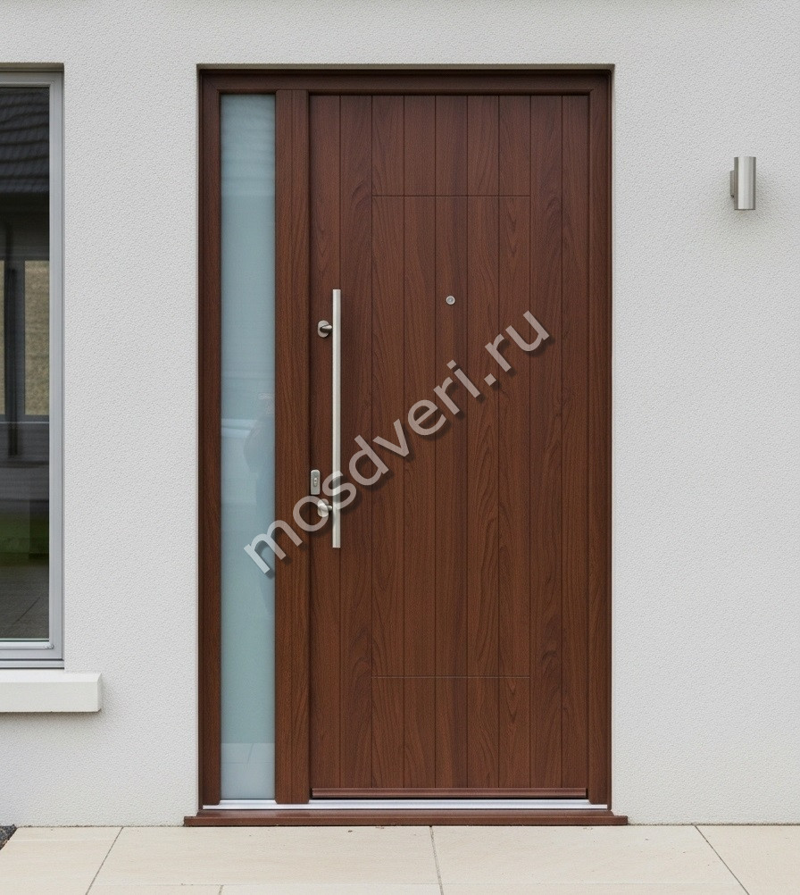 Высокая входная дверь в коттедж коричневого цвета со стеклом — оформите заказ уже сегодня! Позвоните нам, и получите бесплатную консультацию уже сегодня. Выезд специалиста — по вашему графику!